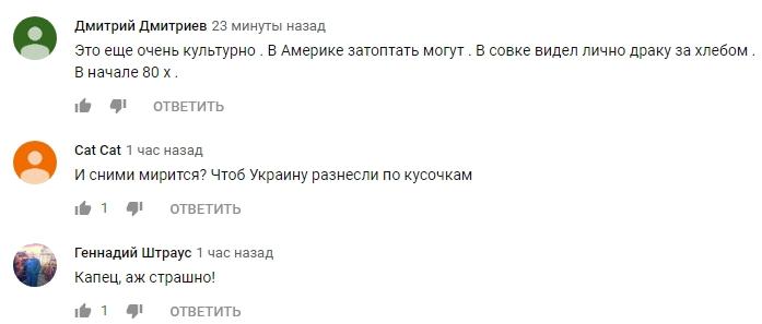 "И с ними мирится? Чтоб Украину разнесли по кусочкам", "Капец, аж страшно!", "DIKARI!!!", "Это еще очень культурно. В Америке затоптать могут. В совке видел лично драку за хлебом. В начале 80 х".