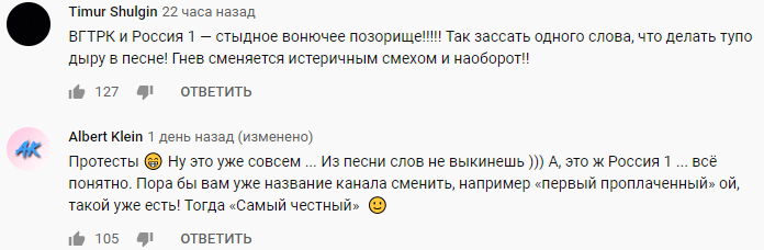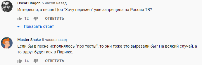 В оригинале в песне звучат слова: "Если чуть светлей проспекты И нежней протесты Юношей в пуловерах Смейся на таких контекстах...". Но канал "Россия 1" решил слово "протесты" заглушить, как обычно делают с ругательствами и прочим нежелательным в эфире контентом.
