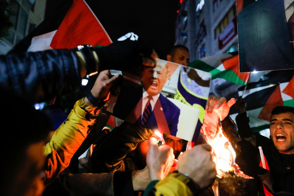 На улицах в Секторе Газа вспыхнули массовые протесты. Люди жгут портреты Трампа и Нетаньяху, чучело американского президента, флаги Израиля и США.