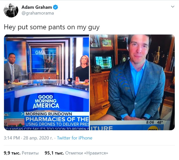 Репортер американского телеканала ABC Уилл Рив 28 апреля появился в прямом эфире одной из программ без штанов, чем произвел настоящий фурор в сети.