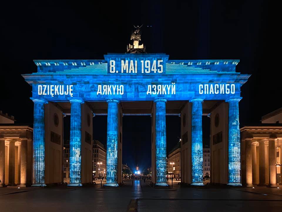 В столице Германии провели яркую акцию в честь 75-летия победы над нацизмом во Второй мировой войне. Поздним вечером на знаменитых Бранденбургских воротах в центре Берлина высветились слова благодарности на нескольких языках - в том числе и на украинском.