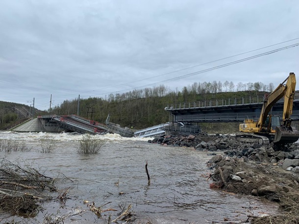 В Росси обрушился железнодорожный мост, из-за чего Мурманск остался без железнодорожного сообщения. Причина обрушения - поднятие уровня воды в реке, на которой стоял мост.