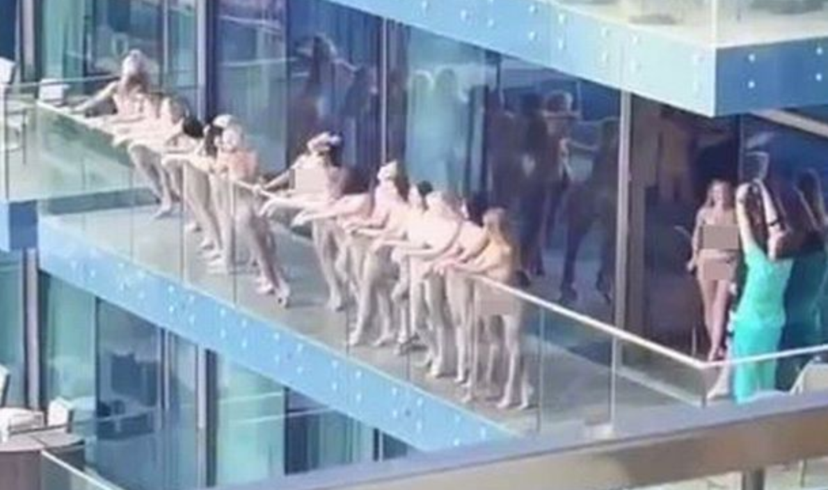 Вечером в субботу в соцсетях появились фото и видео, снятые, вероятно, из окна соседнего здания. На кадрах группа обнаженных девушек выстроилась в ряд на балконе небоскреба и позировала для съемки, передает Час Пик со ссылкой на зарубежные СМИ.