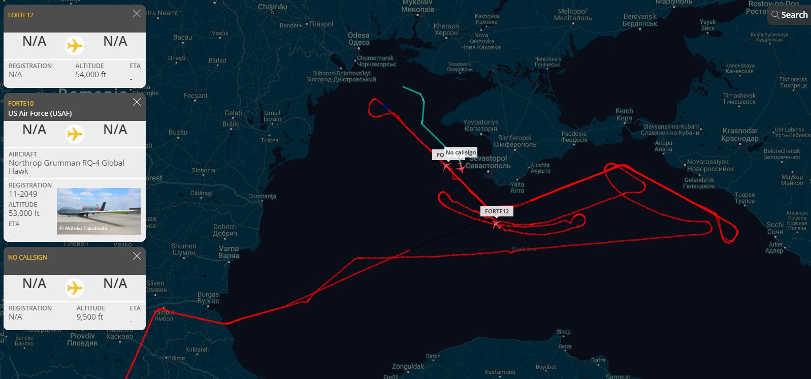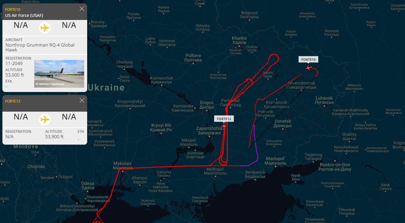 Как сообщают специальные сервисы, над Украиной и в Черноморском регионе кружили стратегические беспилотники США Global Hawk с позывными FORTE-10 и FORTE-12. Их работу дополнял американский морской патрульный самолет Boeing P-8A Poseidon, передает Час Пик.