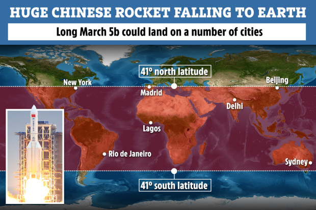 21-тонная китайская ракета Long March 5B, запуск которой был осуществлен 29 апреля, неконтролируемо возвращается на Землю.