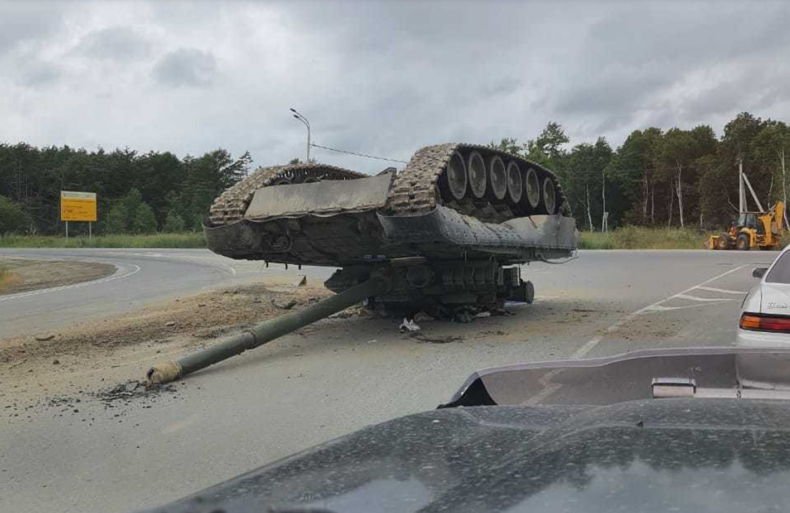 Танк упал с тягача на трассу на въезде в Южно-Сахалинск. По информации прессы, он не был закреплен, поэтому на одном из поворотов свалился с трала.
