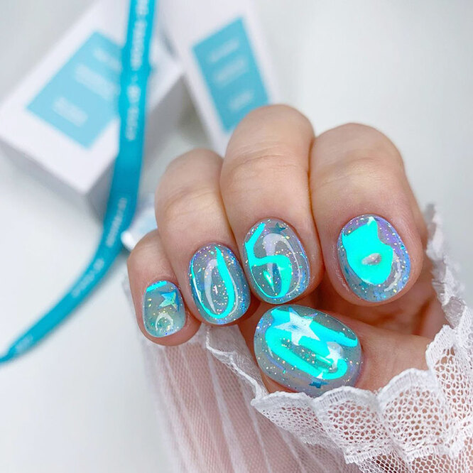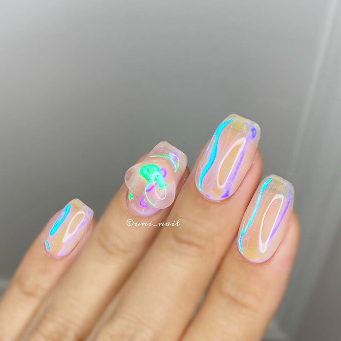 Чтобы добиться красивого перелива, можно использовать второй слой лака с перламутровым эффектом или небольшими блесточками. В Южной Корее даже начали выпускать специальные гель-лаки для создания этого нейл-арта - "Aurora".