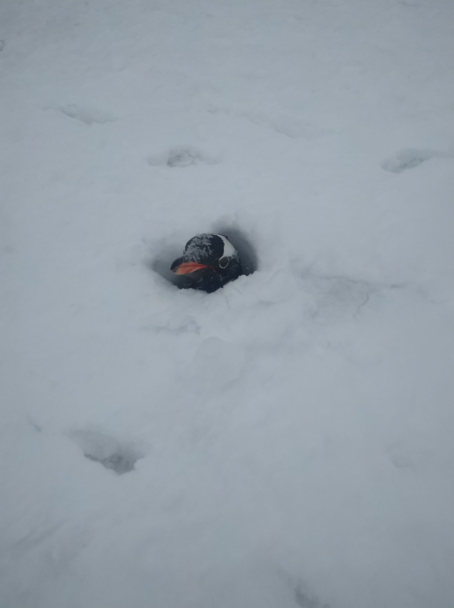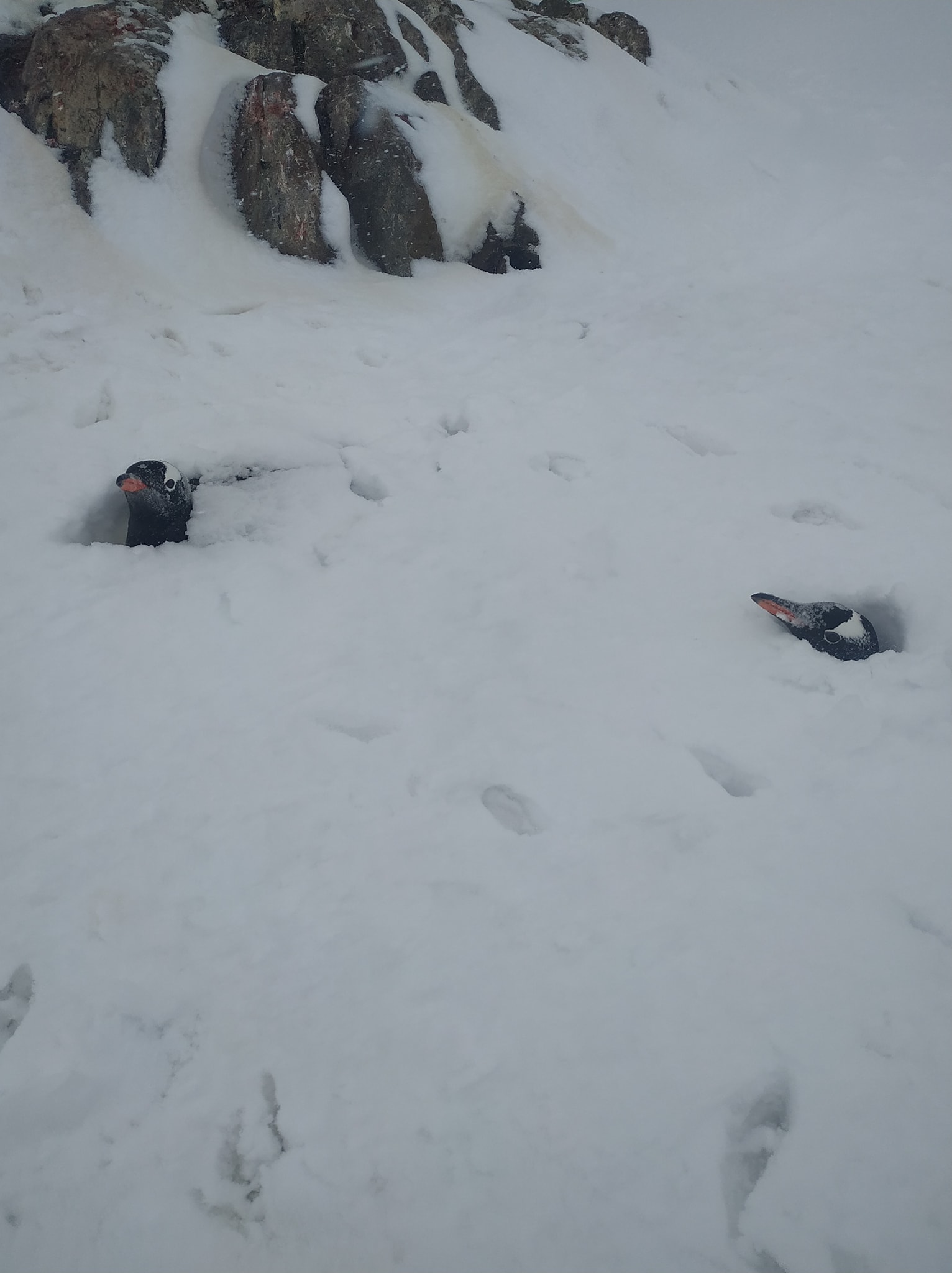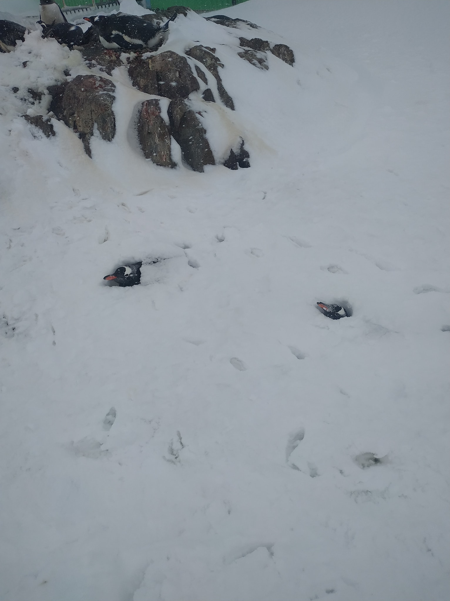 Сообщается, что гнезда пингвинов, которые расположены на низменностях, полностью засыпало снегом: из них торчат только головы птиц, которые продолжают высиживать яйца. А вот тем пингвинам, которые успели занять самые лучшие места на возвышенностях, повезло больше – их припорошило лишь частично.