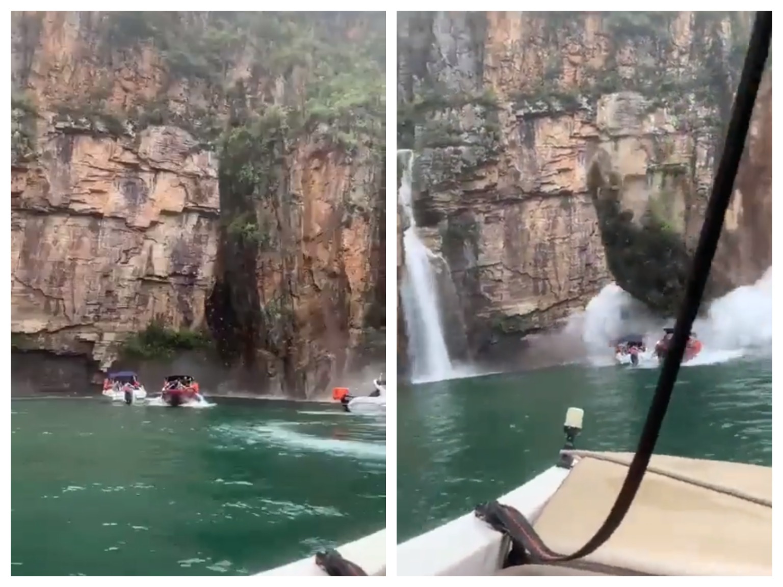 Туристы на прогулочных лодках осматривали водопад, когда огромный кусок скалы откололся и рухнул на несколько лодок.