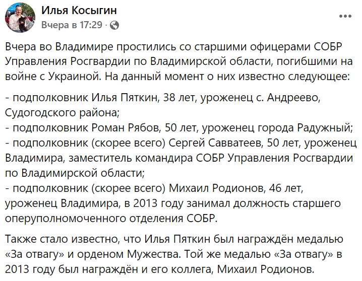 "Вы понимаете весь масштаб пи**еца? У нас за все 30 лет существования владимирского СОБРа вообще не было потерь личного состава. А вчера за один день похоронили все его руководство", - пишет Косыгин.