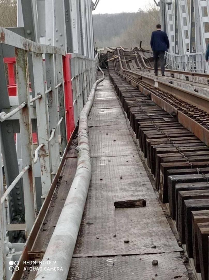 Судя по фото с места происшествия, которые появились в сети, разрушена одна из плит железнодорожного моста.