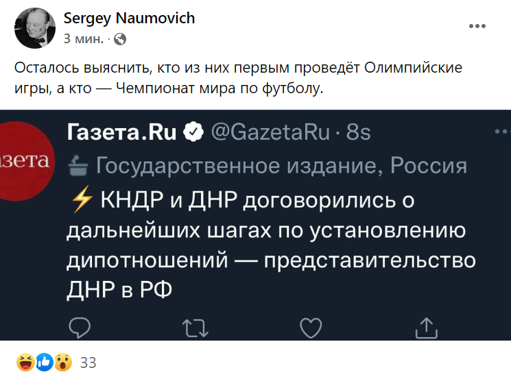 "Осталось выяснить, кто из них первым проведёт Олимпийские игры, а кто — Чемпионат мира по футболу", - прокомментировал новость блогер Сергей Наумович.