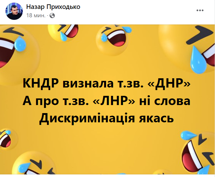 "КНДР признала т.н. «ДНР». А о т.н. «ЛНР» ни слова. Дискриминация какая-то", - "возмутился" блогер Назар Приходько.