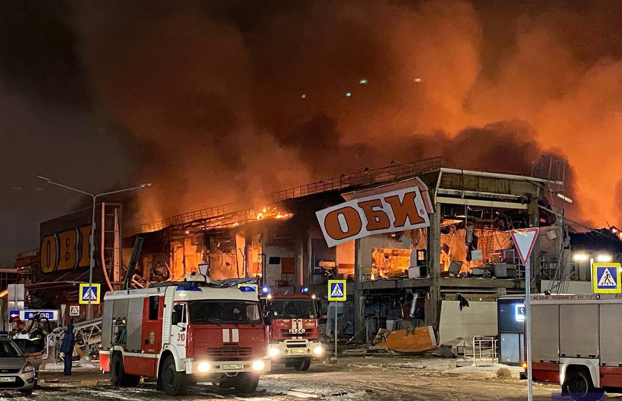 "Пожар начался с соседнего гипермаркета "OBI", который выгорел весь. В данном крыле находились различная мебель и деревянные сооружения. Далее огонь охватил всю площадь супермаркета "МЕГА Химки" и начались взрывы газовых баллонов и банок с красками. В здании началось обрушение кровли", - сообщают в сети.