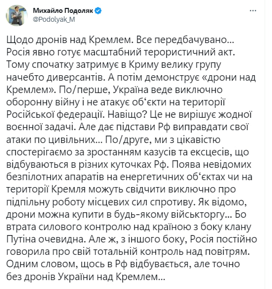 Советник главы офиса президента Украины Михаил Подоляк в комментарии СМИ заявил, что Киев не имеет никакого отношения к атакам дронов на Кремль.