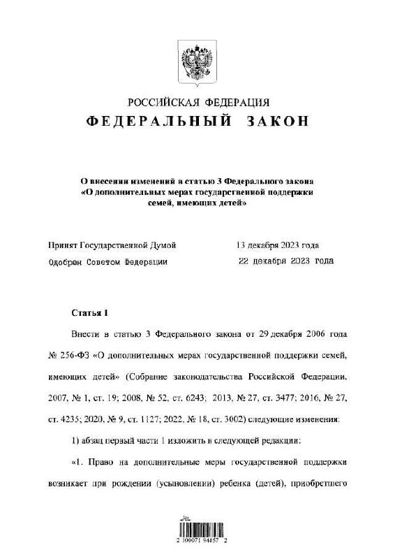 Сегодня, 25 декабря, президент РФ Владимир Путин подписал закон, корректирующий правила выплаты материнского капитала.