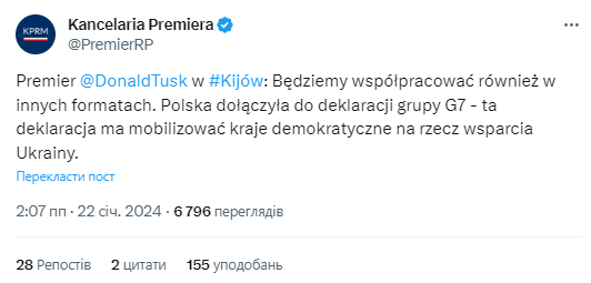 Сегодня, 22 января, во время своего визита в Киев, премьер-министр Польши Дональд Туск заявил, что Польша присоединится к декларации G7, которая работает над гарантиями безопасности для Украины. По его мнению, это должно мобилизовать демократические государства для поддержки нашей страны.