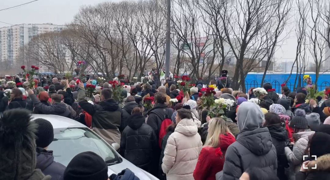 Возле храма выстроилась почти километровая очередь из желающих попрощаться с оппозиционным политиком. Собравшиеся у церкви забросали катафалк с гробом политика цветами. В толпе были слышны возгласы "Спасибо, Алексей". Как сообщили российские СМИ, возле церкви связи практически не было из-за того, что ее глушили.