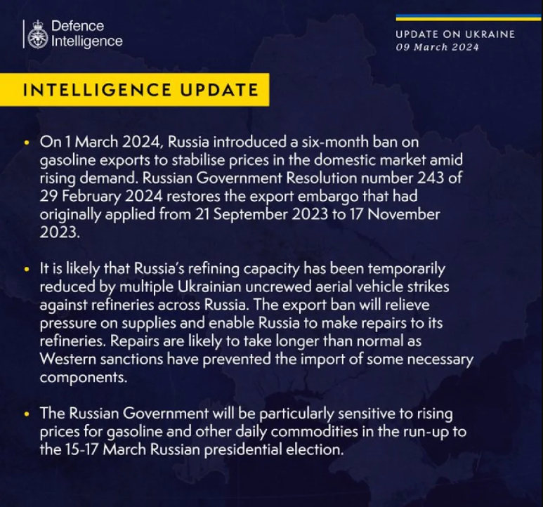 Прицельные удары Украины по российским НПЗ заставили Кремль ввести запрет на экспорт бензина. К середине февраля 2024 года от ударов БПЛА пострадало 20 объектов нефтяной отрасли РФ. К концу февраля и в марте добавилось еще с десяток повреждений.