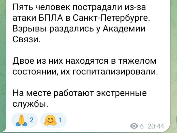 "Семь человек пострадали из-за взрыва в академии связи имени Буденного на Тихорецком проспекте в Санкт-Петербурге. Предположительно, она была атакована беспилотником, однако официально эта информация не подтверждена", — говорится в сообщении.