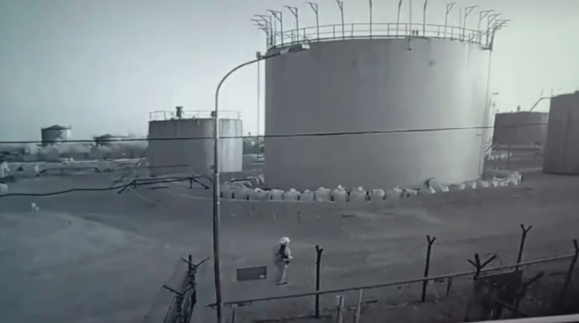 Момент атаки БПЛА по нефтебазе попал на видео. Видно, как охранник, вооруженный антидроновым ружьем пытается сбить беспилотники, однако его попытки были тщетны.