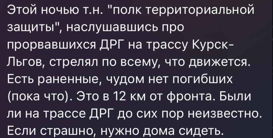 По данным Сапонькова, инцидент произошел на трассе Курск-Льгов, всего в 12 километрах от линии фронта. Он сообщил, что бойцы так называемого "полка территориальной защиты", услышав о возможном прорыве диверсионно-разведывательных групп (ДРГ) на указанную трассу, начали стрелять по всему, что двигалось. В результате обстрела есть раненые, но, по словам корреспондента, погибших пока нет.