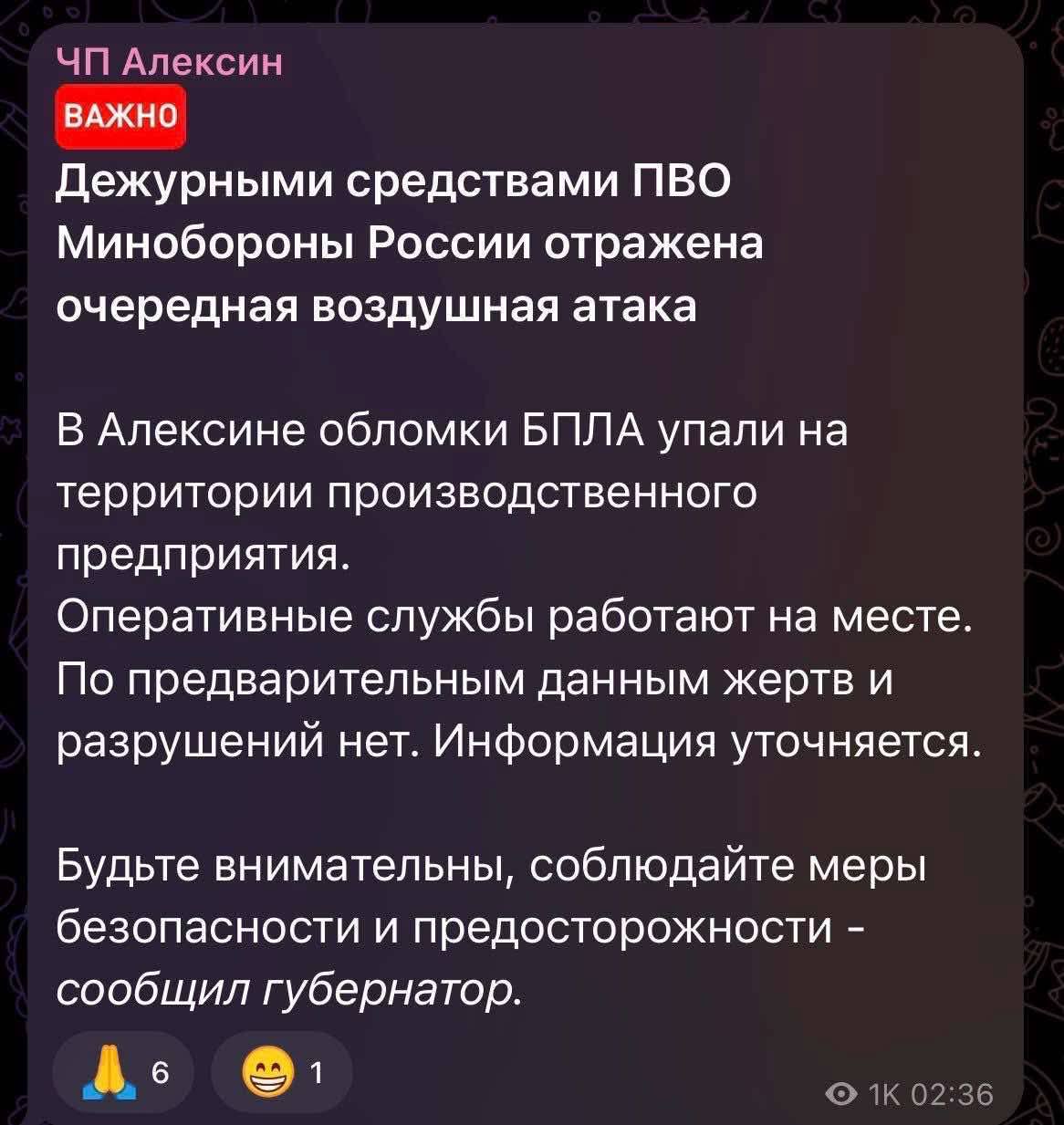В соцсетях жители Алексина отмечали, что слышали "гулкие удары", после которых в небе был заметен дым. Российские официальные структуры пока никак не комментируют произошедшее, не называя ни масштабов разрушений, ни возможных жертв среди персонала.