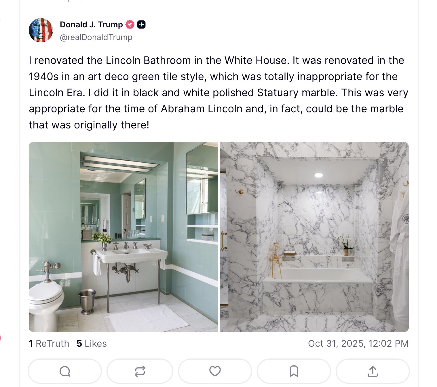Обновленная ванная выполнена из черно-белого статуарного мрамора и, по словам Трампа, «больше соответствует эпохе Авраама Линкольна». Президент заявил, что прежний интерьер в зеленом ар-деко «совершенно не подходил» для комнаты XIX века.