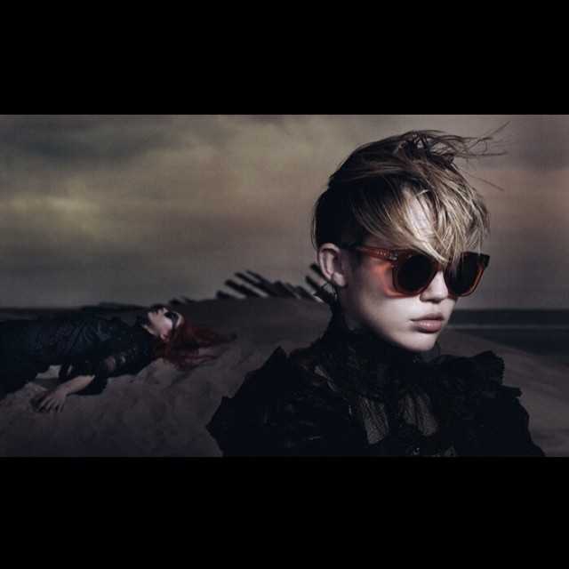 На фото певица одета в черный полупрозрачный топ с высоким воротом и пышными рукавами из коллекции весна-лето 2014, а глаза Майли закрывают темные очки в красной оправе. Мрачный образ певицы завершает темный пейзаж – пасмурное небо и серый песок.