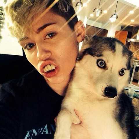 Певица Майли Сайрус не перестает удивлять своими поступками! На своей странице в социальной сети Майли выложила фото, где обнимает свою собаку, а во рту у нее большого размера вставные зубы.