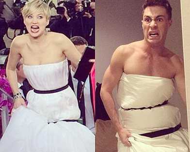 Оскароносная красотка пришла на "Золотой глобус" в длинном белом платье, перевязанном черными лентами, от известного Christian Dior. После появления актрисы на красной дорожке в сети начали появляться сразу же мемы и демотиваторы на платье.