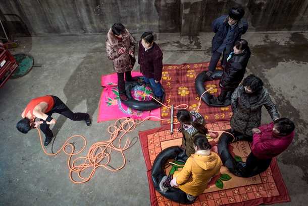63-летний Не Юнбин накачивал шины, предварительно воткнув в ноздрю резиновый шланг, куда он выдыхал воздух из легких, причем задачу усложняли восемь человек, стоявших на шинах - по двое на каждой.