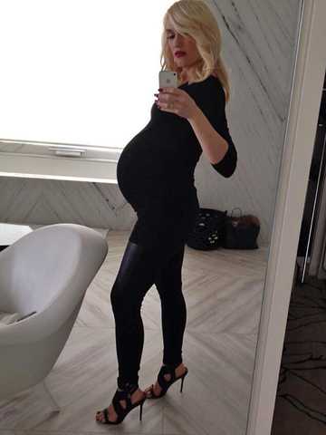 Красавица Гвен не изменяет своему стилю, даже находясь на столь большом сроке беременности. На фото певица одета в обтягивающие кожаные лосины, тунику и босоножки на высокой шпильке.