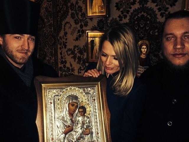 На снимках девушка присутствует вместе с монахами, а в руках держит икону. Под снимком Ольга Фреймут написала: