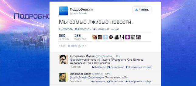 Сегодня ночью на официальном twitter-аккаунте программы «Подробности» (телеканал «Интер») появилось сообщение с признанием: «Мы самые лживые новости», сообщает MediaSapiens .