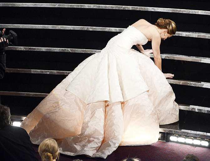 Настоящий ажиотаж вокруг своей персоны вызвала актриса Дженнифер Лоуренс. 23-летняя звезда упала прямо на звездной дорожке. Лоуренс, облаченная в роскошное красное платье в пол от Dior, оступилась и чуть было не свалила с ног впереди идущую девушку. На помощь актрисе подоспели ее сопровождающие и организаторы премии.