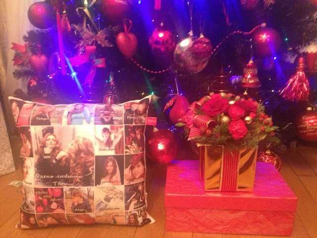 На фото изображена новогодняя елка и красивая подушка, на которой множество изображений Могилевской в компании друзей.