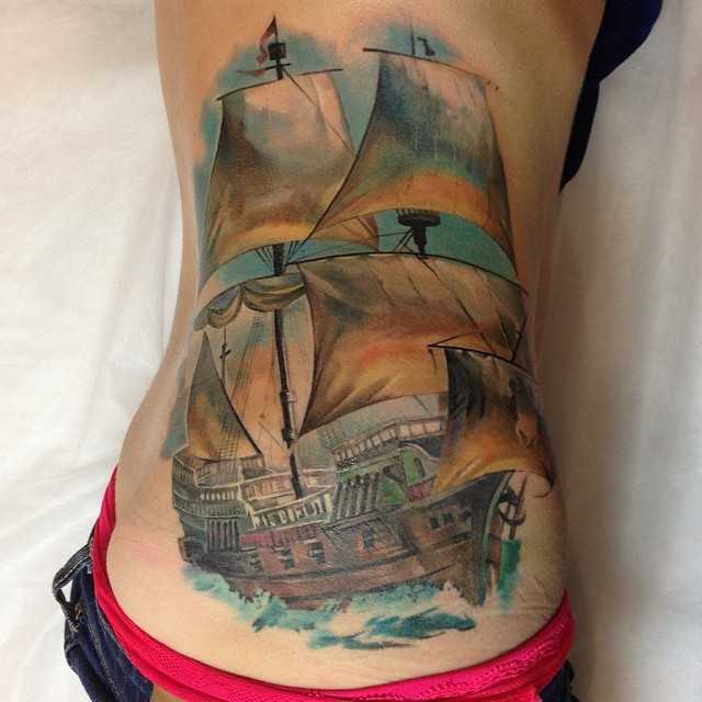 Девушка набила себе очень большое тату на боку. На рисунке, который выставила Наталья Гордиенко, изображен большой корабль.