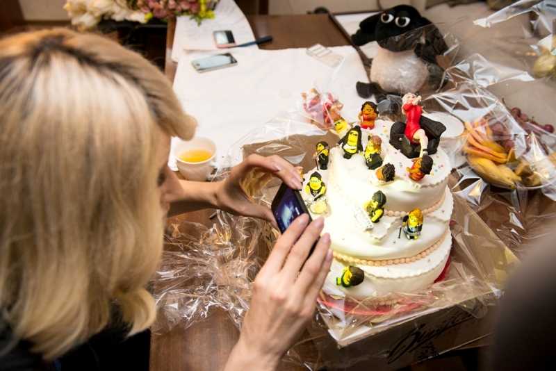 Торт коллектив LOBODA делил шумно и весело. Под бурный смех команда решала, кто съест, чью фигурку. На артистку покушаться никто не рискнул, поэтому под громкие крики LOBODA взяла свою фигурку и сама откусила ей голову.