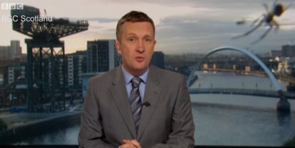 Это произошло в эфире новостей BBC Шотландии. Паук пополз через линзу камеры, захватил какое-то насекомое, а затем отступил с добычей.<