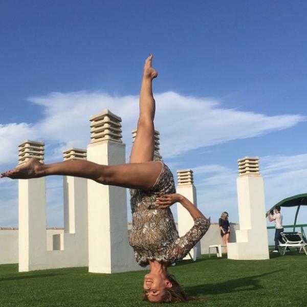На этот раз в ее фотогалерее появился очередной эффектный фотоснимок. На нем девушка стоит на голове, делая ногами прямой угол. Безусловно, это очень тяжело и требует опыта и настойчивости в занятиях.