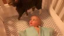 На видео видно, как мать мальчика приносит кота и осторожно кладет его в колыбель с ребенком, внимательно наблюдая за его реакцию. Как только младенец видит кошку, начинает трогательно смеяться и махать маленькими ручками и ножками от восторга.