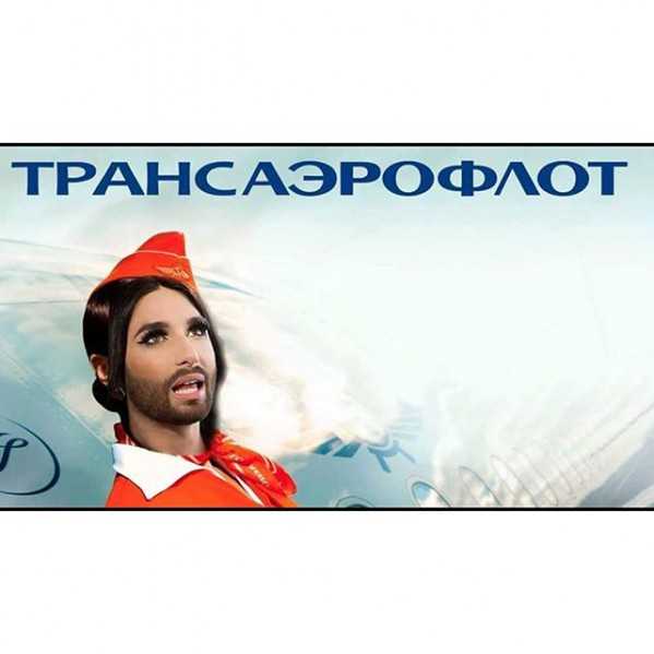 Бородатая певица представлена в образе стюрдессы несуществующей в реальности компании «Трансаэрофлот». Басков поиграл со значением слова «транс».
