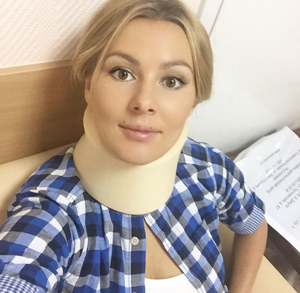 Мария Кожевникова опубликовала в своем Instagram фото, на котором запечатлела себя со специальным бандажом на шее, и рассказала, что неудачно упала, когда выполняла трюк, и повредила шею.