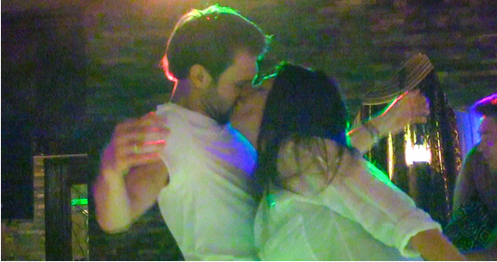 Сначала пара сидела за столом, но потом переместилась на танцпол, где станцевала страстное танго с поцелуями, а затем в обнимку отправилась на автостоянку.