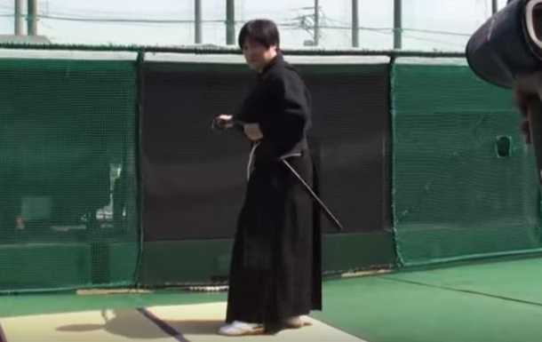 На видео самурай по имени Исао Мачи без особых усилий разрезает на две половинки бейсбольный мяч, который летит со скоростью около 160 км/ч.