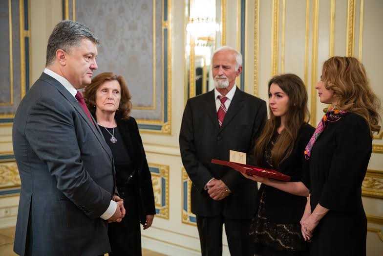 В субботу, 31 октября, президент Украины Петр Порошенко вручил родителям, вдове и дочке Андрея Кузьменко (известного как Кузьма Скрябин) орден "За заслуги" I степени.