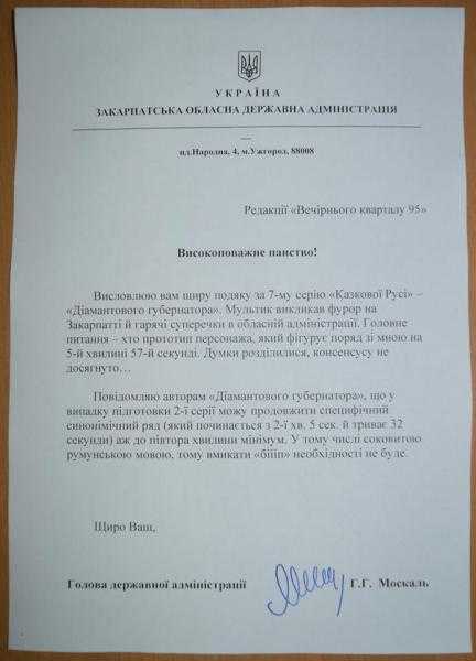 Москаль также направил благодарственное письмо в редакцию Вечернего квартала 95.