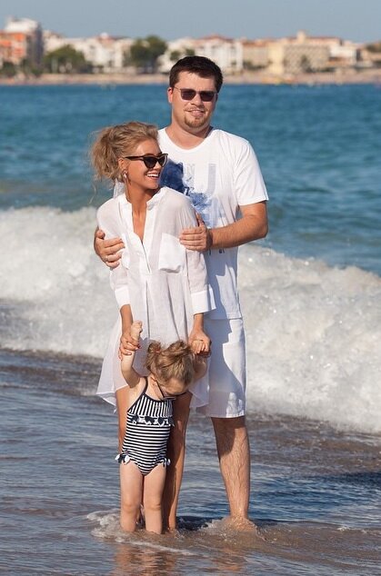 На снимке Кристина и Гарик в белых нарядах стоят на берегу моря, держа Анастасию, одетую в бело-синий купальник, за ручки.