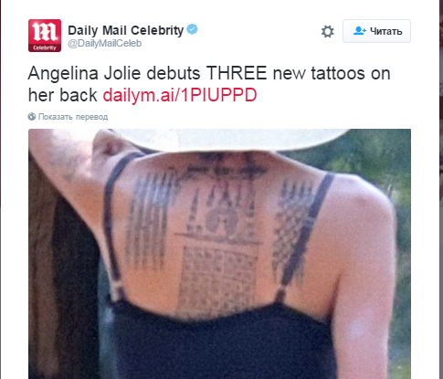 Это далеко не первые татуировки Джоли. Когда Анджелина была помоложе, на ее левом плече красовался восточный дракон. После ее тело украшали различные картинки и надписи. В 2015 году на левой руке актрисы было замечено очередное новое тату.